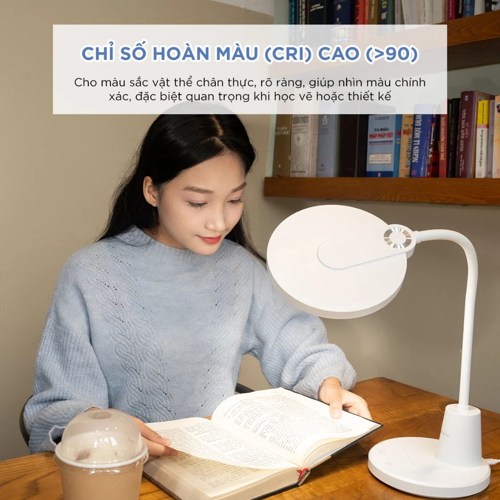 Thứ hai là chỉ số hoàn màu (CRI hay Ra). Chỉ số này thể hiện khả năng tái tạo màu sắc của đèn so với ánh sáng tự nhiên, càng cao càng trung thực. Với đèn học, nên chọn loại có CRI từ 90 trở lên để trẻ nhận diện màu sắc chính xác khi đọc sách, vẽ tranh, làm bài. Đèn rẻ thường có CRI chỉ 70 - 80, nhìn màu bị bệt và sai lệch.
