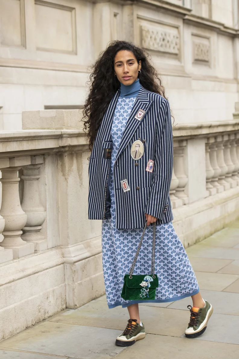 Đầm thướt tha + blazer và giày sneaker