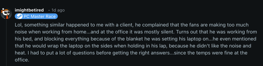 Trên Reddit, một người dùng chia sẻ câu chuyện tương tự: khách hàng của anh phàn nàn quạt laptop kêu to khi làm việc ở nhà, trong khi ở văn phòng thì máy chạy im lặng bình thường. Sau một hồi tìm hiểu, hóa ra người này thường xuyên đặt laptop trên giường, để máy nằm trực tiếp trên chăn. Tệ hơn, anh ta còn lấy chăn quấn quanh hai bên thành máy vì "không thích tiếng ồn và hơi nóng phả ra." Kết quả là toàn bộ khe hút gió và khe xả nhiệt đều bị bịt kín, máy nóng lên nhanh chóng.